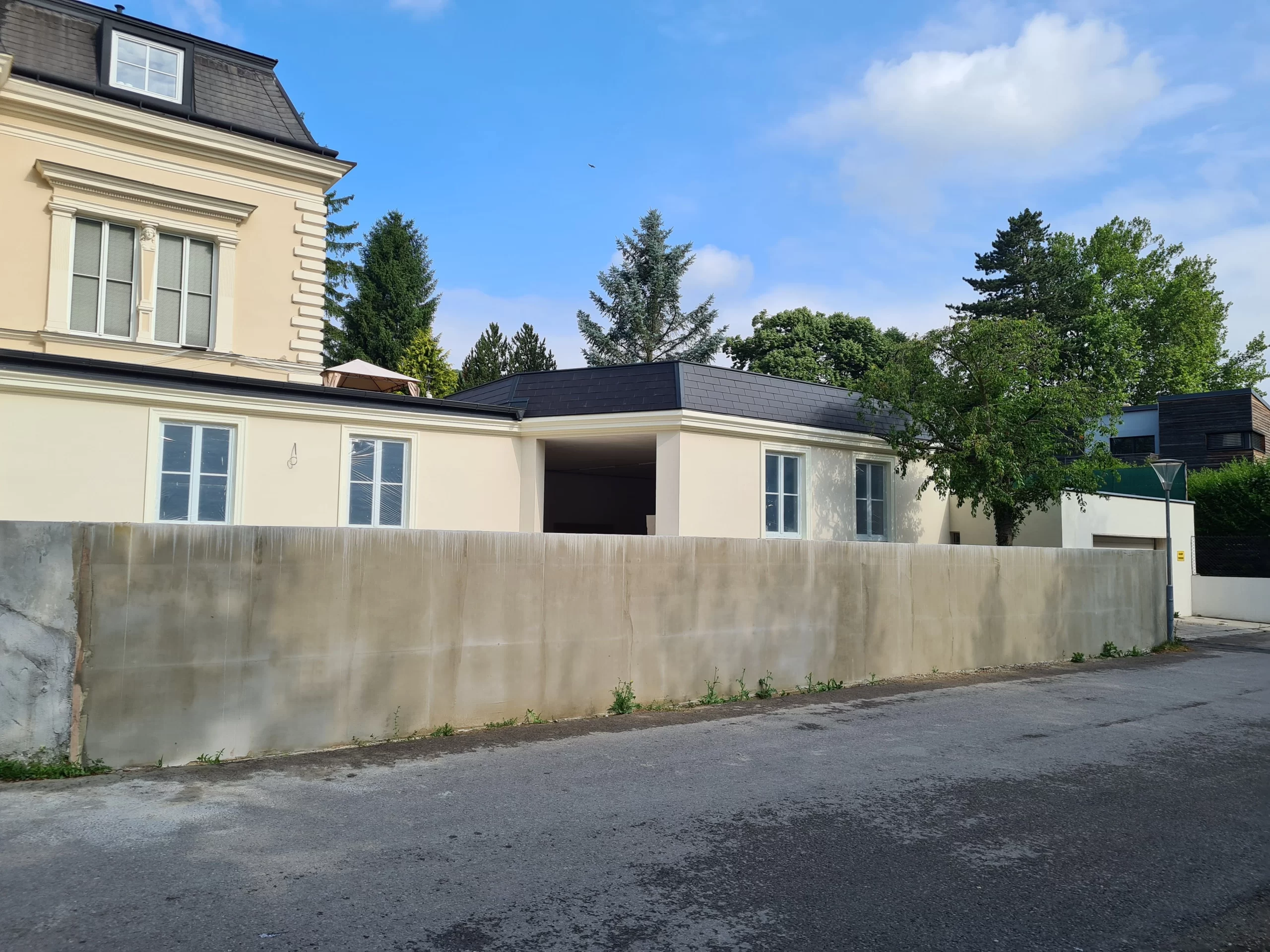 Leistungen: Architektonisch angepasster Zubau, Fassadenerneuerung, Außenanlagenbau