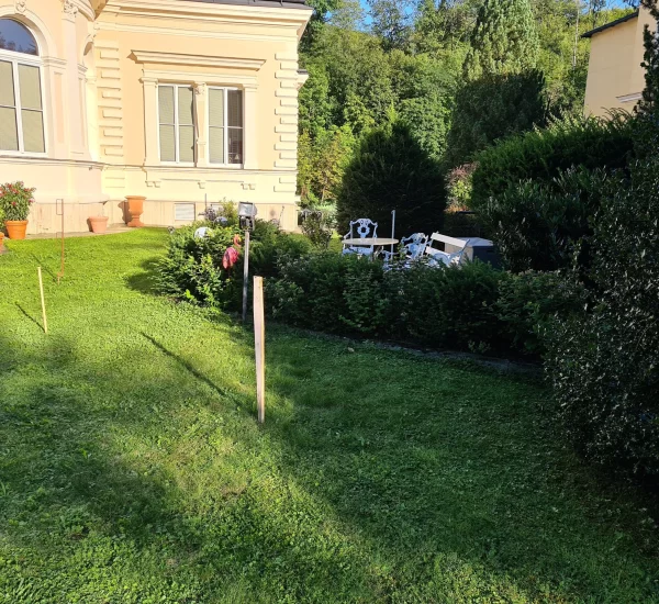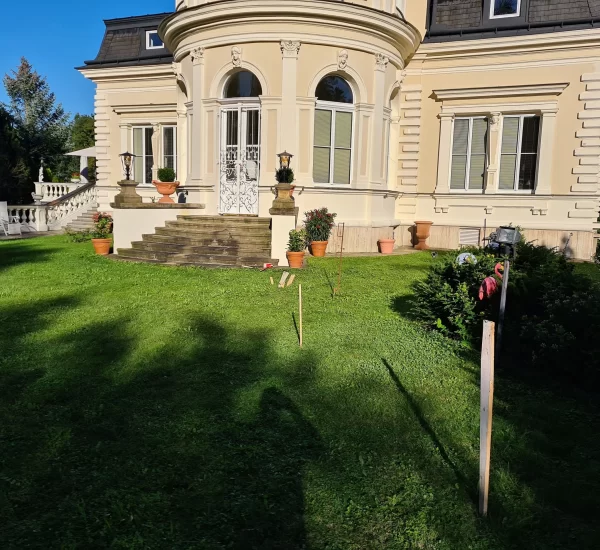 Zum Projekt gehörte auch die Neugestaltung der Außenanlagen, um die Gesamterscheinung der Liegenschaft aufzuwerten und funktional zu optimieren. Die Planung der Außenbereiche folgte dem Stil der Jahrhundertwende-Villa und legte Wert auf klare Formen, hochwertige Materialien und pflegeleichte Ausführungen.