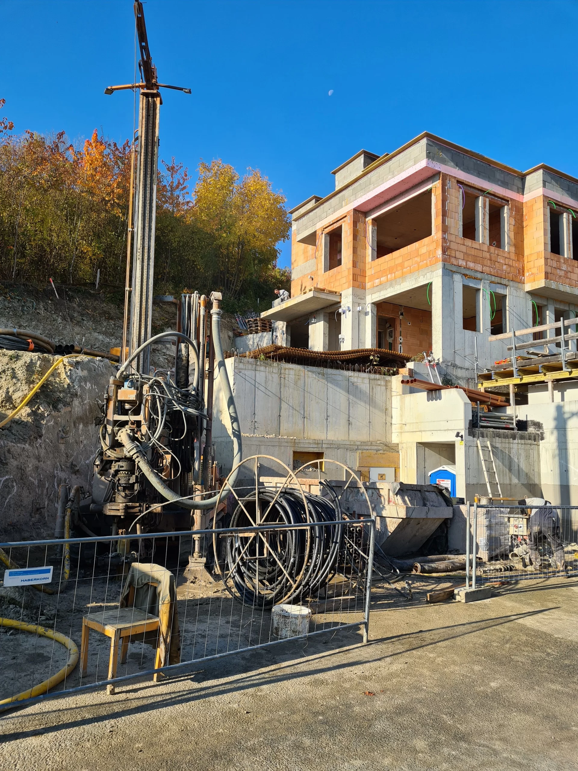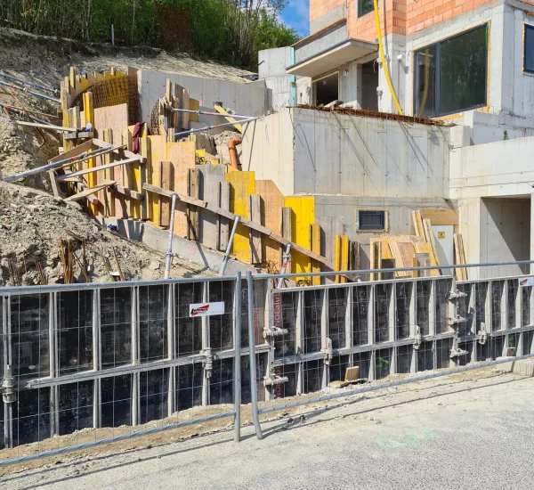Ein zentrales Merkmal dieses Bauprojekts war die steile Hanglage des Baugrundstücks. Dadurch ergaben sich sowohl geotechnische als auch baulogistische Herausforderungen, die eine präzise Planung und spezialisierte Umsetzung erforderten. Die Wahl der geeigneten Fundamente, die Stabilisierung der Hanglage und die effiziente Erschließung des Grundstücks bildeten die Grundlage für die erfolgreiche Durchführung.