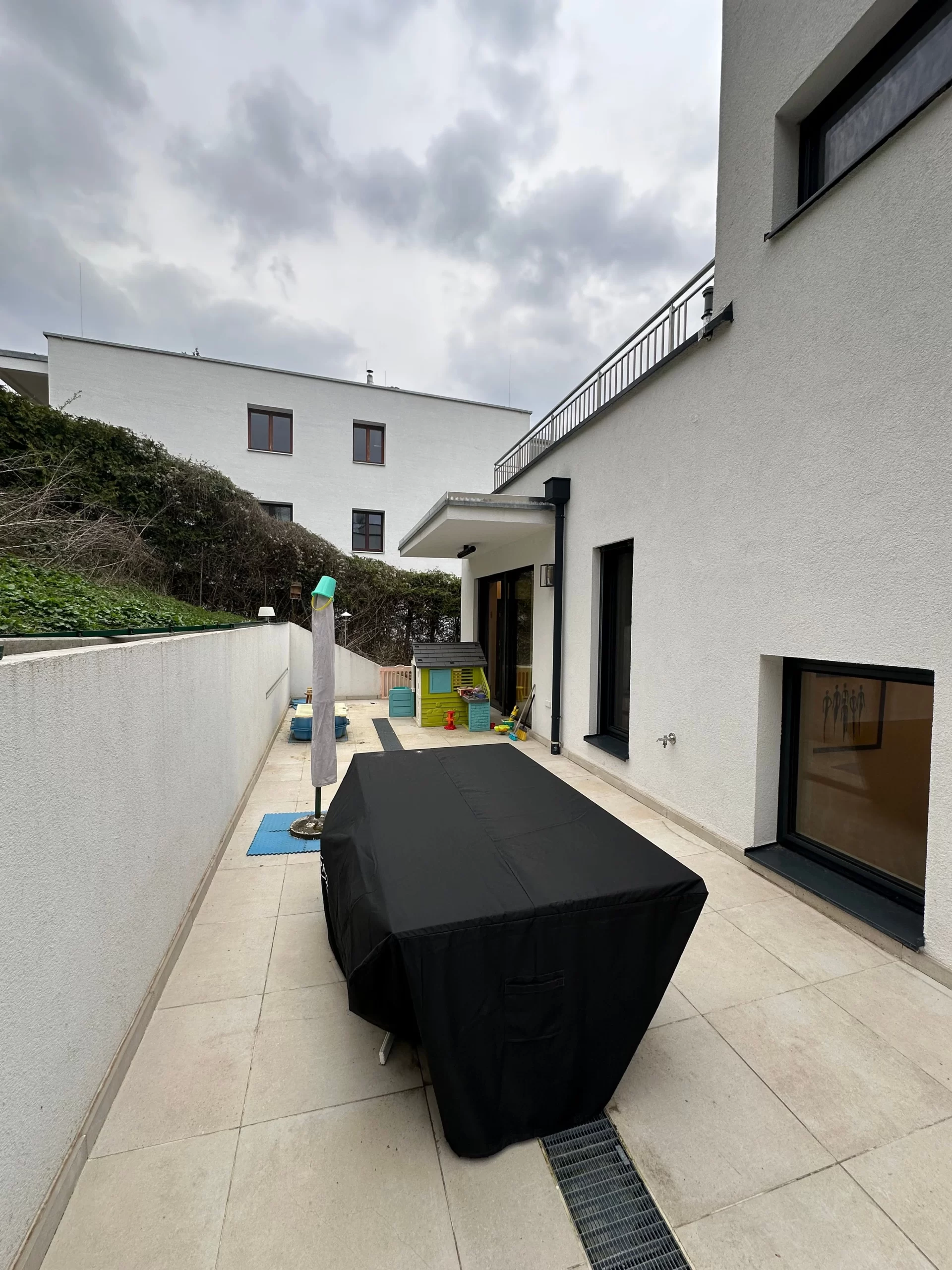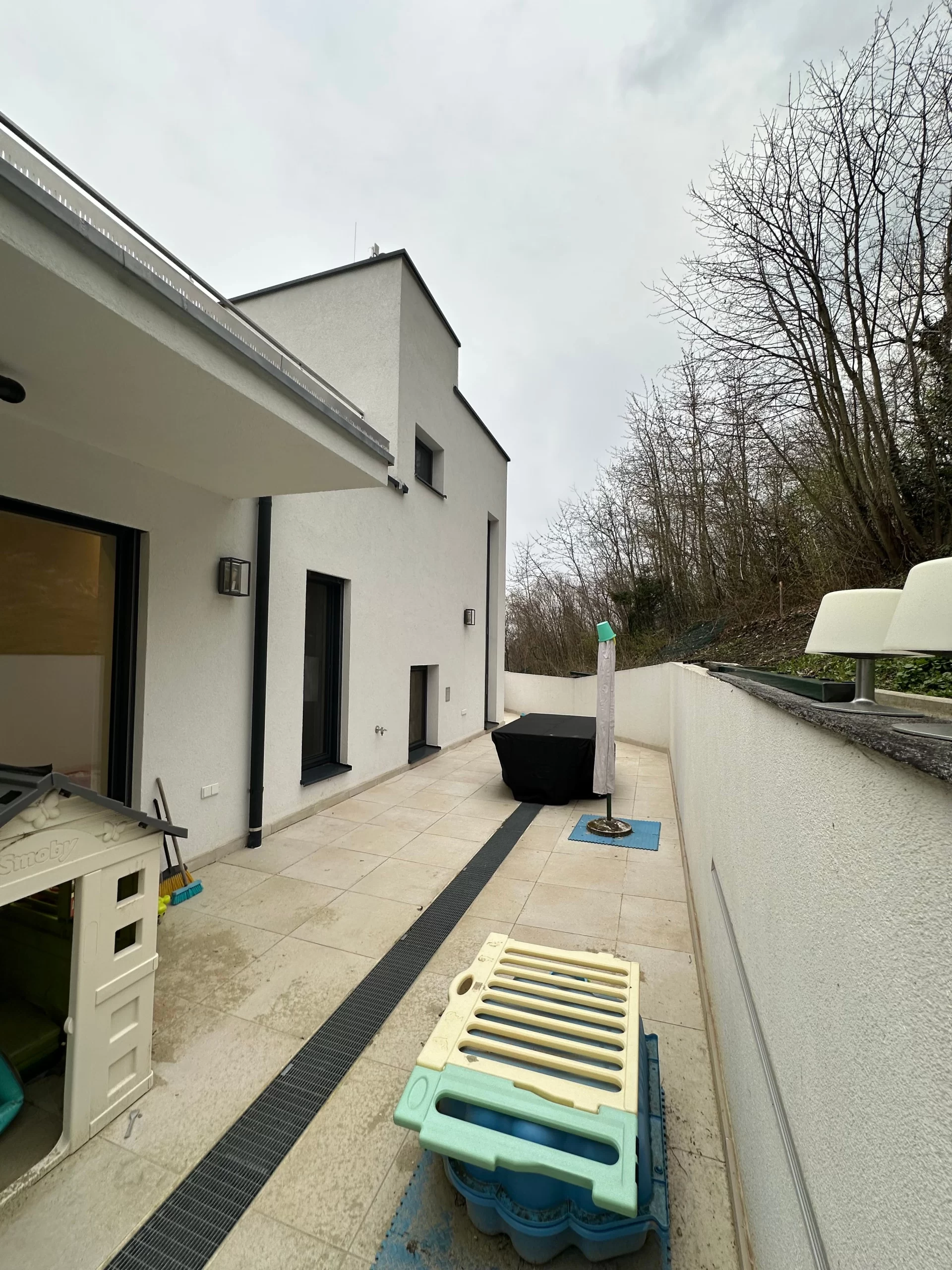 Durch die sorgfältige Planung der Außenbereiche wurde ein harmonisches Gesamtbild geschaffen, das den naturnahen Charakter des Standorts unterstreicht und gleichzeitig praktischen Alltagskomfort bietet.